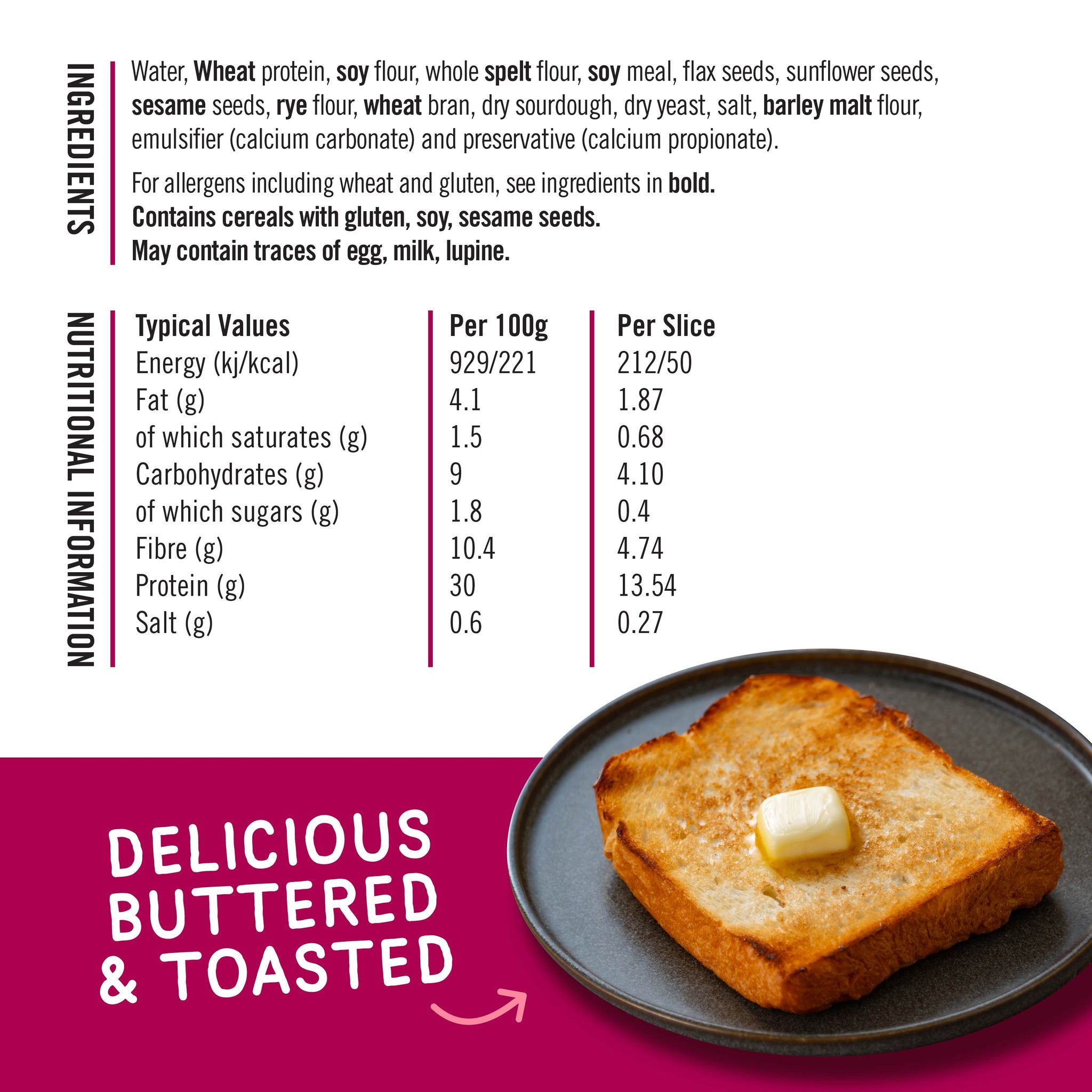 Water, Wheat protein, soy flour, whole spelt flour, soy meal, flax seeds, sunflower seeds, sesame seeds, rye flour, wheat bran, dry sourdough, dry yeast, salt, barley malt flour, emulsifier (calcium carbonate) and preservative (calcium propionate).